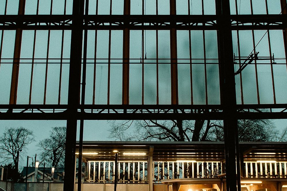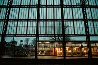 Avondzicht op verlicht stationsperron, gezien door hoge stalen raamspanten tegen een blauwgroene lucht.