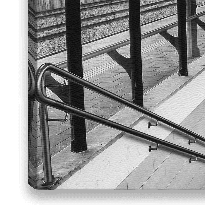 Station Apeldoorn in zwart - wit. Symmetrische foto van de lift tussen perron 2 en 3.