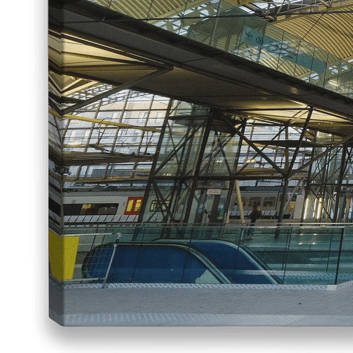 Kleurrijke architectuurfoto van een bijna lege stationshal in Leuven, België. Het hoge geelgekleurde dak heeft grote bogen, wat een ruimtelijk effect geeft.