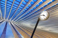 Prachtige abstracte opname van het moderne treinstation Luik-Guillemins (Liège-Guillemins) in Luik, Belgie, met een perspectief lijnen van stalen balken in het blauwe uur en een stationsklok