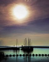 Schepen voor anker in de haven van Stavoren, Friesland met op de achtergrond de ondergaande zon.