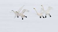 Wilde zwanen vliegen in de winter boven het ijs van het prachtige diepgevroren meer Kussharo, een calderameer in het Akan National Park in het noordoostelijke deel van Hokkaido, Japan.