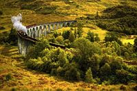 Jacobite steam train on old viaduct in Glenfinnan, Scotland
