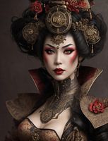 Steampunk Geisha a portret in rood en koper kleuren een mooi abstract beeld voor aan de muur een one of a kind soort portret gegenereerd door ai.