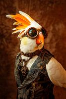 Portret van een parkiet in een steampunk outfit, in de stijl van fantasy met realistische details.