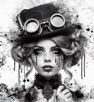 Portret van een mooie vrouw in de stijl van steampunk. In zwart-wit met verfspetters geeft het een bijzondere uitstraling. Het beeld is met behulp van ai gegenereerd.