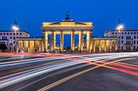 Indrukwekkende nachtopname van de Brandenburger Tor in Berlijn, schitterend verlicht tegen een diepblauwe lucht. Wat dit motief zo bijzonder maakt, zijn de dynamische lichtsporen van passerende voertuigen die als vloeiende energielijnen door het beeld lopen en beweging en stedelijk leven overbrengen. De perfecte symmetrie van het gebouw…