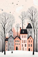 Een sfeervolle winterse illustratie in zachte pasteltinten, waar vijf karakteristieke huizen in roze en grijstinten zij aan zij staan tegen een lichte achtergrond. De kale zwarte bomen en vallende sneeuwvlokken creëren een mysterieuze, sprookjesachtige sfeer, terwijl een kleine silhouetfiguur de schaal en het verhaal van de compositie versterkt.