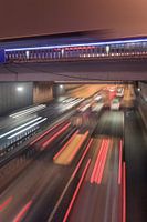 Kleurrijk stedelijk nachtelijk tafereel met onderdoorgang en verkeer in beweging wazig en lichte paden