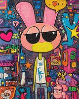 "Urban Bunny Vibes" is een kleurrijk en eigenzinnig stuk dat de speelse geest van street art belichaamt, vermengd met verwijzingen naar de popcultuur. Het centrale personage, een cool en ontspannen konijn met een te grote zonnebril, staat te midden van een chaotische, levendige achtergrond vol symbolen, sterren en hartmotieven. Dit kunstwerk is een viering van het moderne stadsleven en combineert humor, ironie en een vleugje nostalgie. Het nodigt kijkers uit om zich in te leven in de grillige wereld, waar alledaagse stadsgezichten worden omgetoverd tot een dynamisch, expressief canvas.
