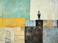 Stedelijke Reflectie - Dit abstracte schilderij toont een eenzame figuur die uitkijkt over een collage van verweerde stedelijke texturen, waarbij de mengeling van robuuste materialen en zachte pasteltinten het contrast tussen de urbaniteit en menselijke aanwezigheid benadrukt.
