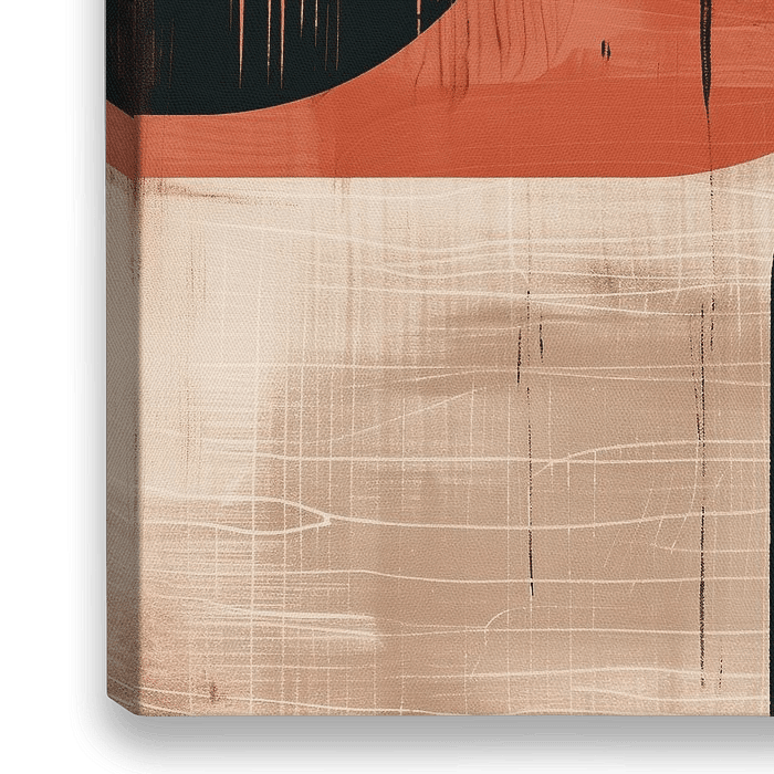 Dit werk speelt met geometrische vormen en een rijk palet van terracotta en zwarte tinten. De strakke lijnen en overlappende vlakken roepen de dynamiek van stedelijke architectuur op. Ideaal voor een modern interieur of een kantoorruimte, waar het een gevoel van ritme en beweging toevoegt. De combinatie van warme en neutrale kleuren…