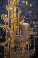 Dit werk toont een stedelijke ruimtekolonie, een geavanceerde nederzetting die in de diepe ruimte zweeft. De structuur bestaat uit complexe bouwwerken en torens, verbonden door delicate bruggen en ondersteund door diverse mechanische onderdelen. De gouden en bronzen tinten geven de kolonie een futuristisch en toch rustiek gevoel, terwijl de donkere achtergrond de oneindigheid van de ruimte benadrukt. Kleine lichtjes en cirkelvormige elementen suggereren actieve energiebronnen en communicatieapparatuur die de kolonie in leven houden. Dit werk biedt een fascinerende blik op een mogelijke toekomst waar de mensheid nieuwe werelden verkent en bewoont.