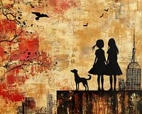 Stedelijke Verhalen - Dit urban kunstwerk vertoont twee silhouetten van meisjes zij aan zij met een hond, uitkijkend op een vrij abstracte stadsskyline, met vliegende vogels en een achtergrond die overgaat van donker naar licht met prominente rode en gouden tinten.
