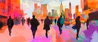 Een levendig stadslandschap dat de dynamiek van het stadsleven vastlegt, met harmonieuze kleurovergangen in levendig roze en oranje. De silhouetachtige figuren stralen beweging en energie uit en nodigen bezoekers uit om de verhalen van de stad te ervaren. Perfect voor een woonkamer, waar het gesprekken over avontuur en inspiratie kan stimuleren.