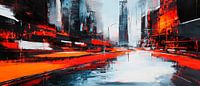 Een levendig stadslandschap in krachtige rood- en grijstinten trekt de kijker de dynamische diepte in. De levendige lichtreflecties en architecturale silhouetten roepen een sfeer op van bruisende stedelijkheid. Dit kunstwerk vindt zijn perfecte plaats in de woonkamer, waar het conversatie creëert en de kamer vult met energie.