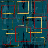 "Urban Jungle" is een donker maar kleurrijk abstract werk dat speelt met ruw getekende felrode en gele vierkanten, pijlen die in verschillende richtingen wijzen en zwarte vervaagde wegmarkeringen.
