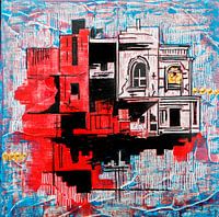 Ik heb acryl en gips samengevoegd om het intrigerende samenspel van textuur en diepte te verkennen. De architecturale vormen zijn geïnspireerd op het futurisme en geven een gevoel van dynamische stilte temidden van een minimalistische achtergrond.