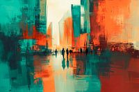 Een dynamisch stadsbeeld strekt zich uit in levendige rode en turquoise tinten, waarin silhouetten van mensen de uitgestrektheid van stedelijke gebieden verkennen. De abstracte architectuur straalt een gevoel van beweging en energie uit. Dit fascinerende kunstwerk is ideaal voor in de woonkamer en verandert elke ruimte in een inspirerende ontmoetingsplek.