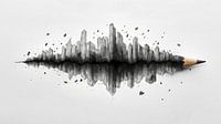 Deze prachtige potloodtekening toont een levendige skyline van een stad die kunstig wordt weerspiegeld op een wit oppervlak. Elk detail van de stedelijke architectuur is vastgelegd met fijne, precieze lijnen die het bruisende leven van de stad in al zijn pracht uitdrukken. De wolkenkrabbers, bruggen en straten rijzen op in een…