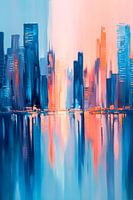Een fascinerend samenspel van levendige blauwtinten en zachte pasteltinten roept de stedelijke polsslag van een stad op. De harmonieuze weerspiegeling in het water geeft een gevoel van diepte en rust. Dit kunstwerk is ideaal voor de woonkamer, verlevendigt de ruimte en nodigt uit tot inspirerende gesprekken.
