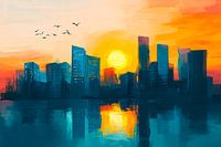 De ondergaande zon gloeit in warme gouden en oranje tinten achter een indrukwekkende skyline, terwijl de donkere silhouetten van de gebouwen worden weerspiegeld in het zachte water. Vogeltjes vliegen elegant over de horizon. Dit levendige tafereel is perfect voor de woonkamer om een uitnodigende en inspirerende sfeer te creëren.
