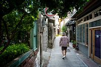 Steegje in Tainan, een stad in Taiwan, met wandelaar die zich vooruit slentert doorheen de hitte van de stad. Deze foto is gemaakt in een stukje van de stad dat Snake Alley heet.