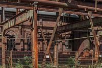 De roestige staalconstructie heeft dezelfde rode kleur aangenomen als de bakstenen van de bebouwing erachter. Beide bouwwerken zijn met elkaar versmolten in dit beeld. Wat gaat er achter de donkere ramen schuil? Hoe heeft deze zonnige plek er voorheen uitgezien? Waar heeft hij voor gediend?
