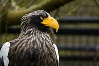 Closeup van een steenarend, zich van zijkant van de arend met felle gele snavel.
