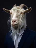 Deze buitengewone compositie toont een witte bok als een gedistingeerde zakenman, die dierlijke majesteit combineert met menselijke professionaliteit. Het werk speelt handig met onze verwachtingen en transformeert een boerderijdier in een respectabele zakenleider.