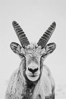 Dit indrukwekkende zwart-wit portret van een steenbok legt de krachtige elegantie en trotse houding van dit bergdier vast. De gedetailleerde weergave van de imposante hoorns en opvallende vacht benadrukt de natuurlijke schoonheid en kracht van de steenbok. Ideaal voor natuurliefhebbers en kunstverzamelaars die hun huis willen verrijken met indrukwekkende en stijlvolle dierenfotografie.