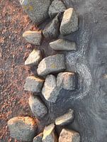 Rij stenen op het strand met verschillende bodems.