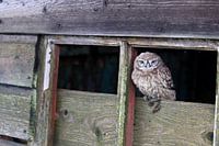 Een portret van een Steenuil in het raam van een oude schuur. De Steenuil leeft solitair. De vogel wordt dankzij zijn kleine formaat weinig opgemerkt. Het voedsel van de Steenuil is aangepast aan zijn grootte: hij vangt wel muizen als hij kan, maar ook veel regenwormen, kevers en andere insecten en kikkers of jonge vogels. Soms verrast…