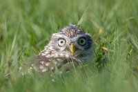 Het is klein, maar zo schattig uiltje. Zeker toen ie zich wilde verstoppen in het (voor hem) hoge gras.