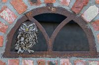 Dit werk toont een steenuil die in het gietijzeren raam van een oude boerenstal op de uitkijk zit.