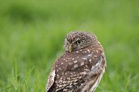 Steenuil in het groene gras kijkt achterom. Het zijn de kleinste uilen die in Nederland voorkomen. Deze werd afgeleid door geritsel achter hem.