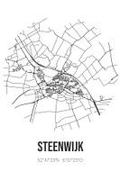 Zwart-witte landkaart, stratenplan of plattegrond van Steenwijk. Steenwijk is gelegen in de gemeente Steenwijkerland, provincie Overijssel. Op de stadskaart zijn alle openbare wegen in Steenwijk opgenomen. Verder is de kaart voorzien van de coördinaten van het centrum van Steenwijk.