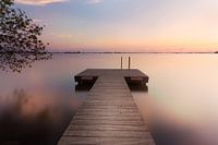 Een rustige serene avond aan de Aldegeasterbrekken in Fryslân. Het is rond zonsondergang. Ik heb een rustige foto gemaakt door een lange sluitertijd. Daardoor zie je wel iets beweging in de takken. Maar dit is minimaal. De steiger bevindt zich in het midden van de foto. Aan de zijkant zie je een boom. Je kunt ver weg kijken. Aan de steiger zit een zwemtrap en bordjes met ondiep niet duiken. De foto is gemaakt in mei 2024 aan de Aldegeasterbrekken/Oudegaasterbrekken, vlakbij het dorp Oudega.