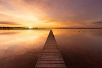 Adembenemende foto van een steiger op het strand van Steendam, genomen tijdens een serene zonsondergang boven het Schildmeer. Het rustige water fungeert als een spiegel, waarin de warme tinten van de zonsondergang – variërend van goud en oranje tot zacht roze/blauw – perfect worden gereflecteerd. De steiger leidt het oog de foto in en vormt een krachtig element dat de stilte en eenvoud van het landschap benadrukt. Deze foto legt de rust en schoonheid van het Schildmeer vast op een manier die zowel tijdloos als betoverend is.