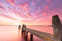 Een waanzinnig mooie zonsopkomst aan de Grevelingen, met een steiger in de voorgrond. Een moment dat het meer dan waard is om vroeg je wekker voor te zetten. Wat een prachtige lucht en heerlijk om zo wakker te worden.