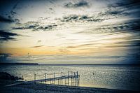 Dit is een moment vlak voor zonsopkomst. Aan het strand is deze steiger gebouwd, grotendeels in het water van de zee. Voor de badgasten is er een trappetje aan het eind vastgemaakt om makkelijk in en uit het water te komen.
