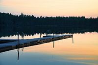 Loopbrug die in een Zweeds meer reikt. Stilleven in Scandinavische natuur.