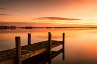 Foto van een steiger bij de ondergaande zon, met een mooie oranje lucht. En glad water.