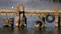 Verweerde steiger met meeuw op het eiland Rügen in Noord-Duitsland