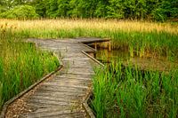 Een steiger in een vijver die bijna volledig met riet begroeid is. Foto genomen in Bokrijk, Genk (België)