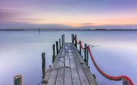 De Ria de Aveiro is een grote ondiepe lagune in het noorden van Portugal. Het is het gebied van de lokale vissers en hun traditionele vismethodes. Hier een van de stijgers van de lagune. Bij zonsopkomst was het water heel rustig hier.