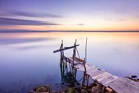 De Ria de Aveiro is een grote ondiepe lagune in het noorden van Portugal. Het is het gebied van de lokale vissers en hun traditionele vismethodes. Hier een van de stijgers van de lagune. Bij zonsopkomst was het water heel rustig hier.