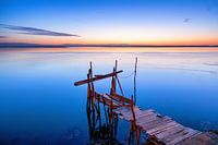 De Ria de Aveiro is een grote ondiepe lagune in het noorden van Portugal. Het is het gebied van de lokale vissers en hun traditionele vismethodes. Hier een van de stijgers van de lagune. Bij zonsopkomst was het water heel rustig hier.