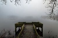 Mistige omstandigheden met nevel op het water maken van deze foto een sfeervolle natuurfoto in natuurgebied de Leemputten in Noord-Brabant in de buurt van Biezenmortel. De oude steiger kijkt uit over het meertje. In de verte doemen twee eilandjes op uit de mist. Een kalm en sfeervol beeld.