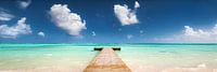 Droomachtige turquoise Caribische zee op een steiger met blauwe lucht en witte wolken.